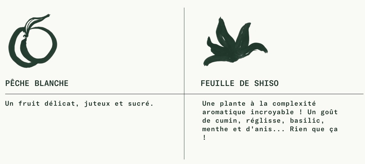 Infusion de shiso*, purée de pêche*, sucre non raffiné*, cidaigre*.