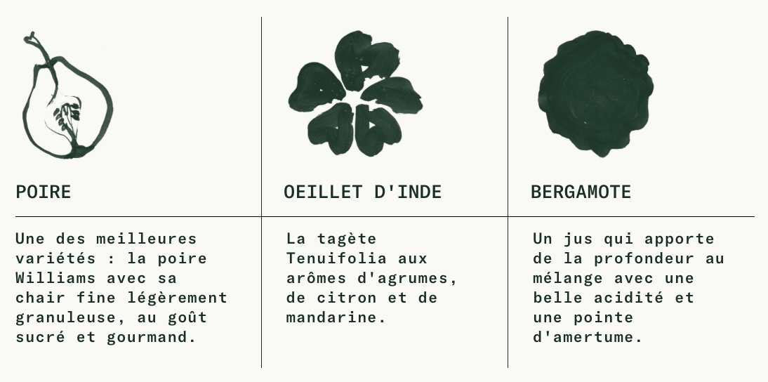 Un jus léger d’une belle couleur dorée mêlant la poire Williams, douce et suave, qui vient lier ces parfums singuliers que sont la bergamote, à la fois acidulée et amère, et la tagète ténuifolia, variété d’oeillet d’Inde de nos vergers, aux notes citronnées.