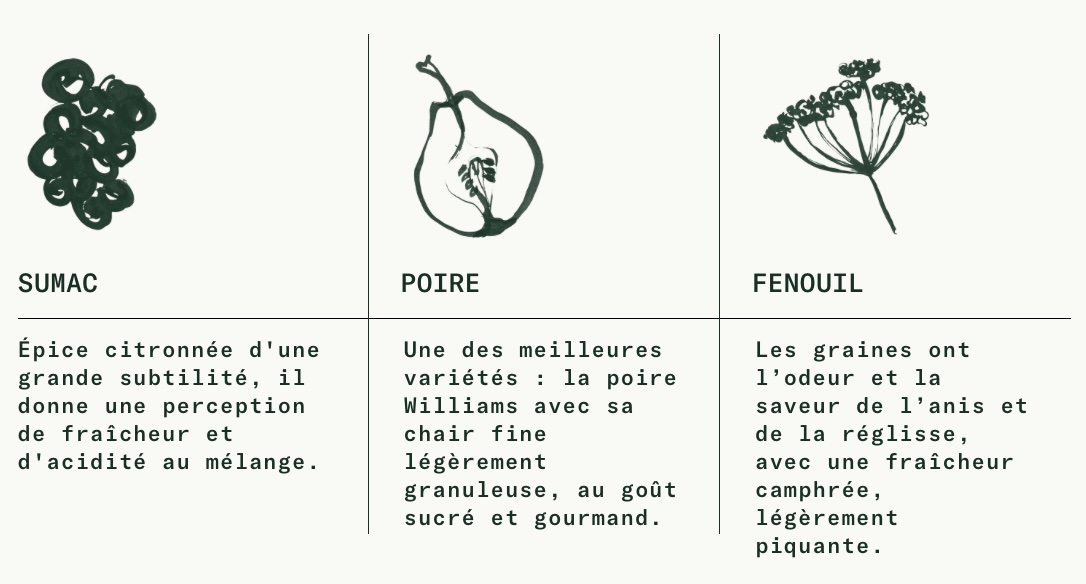 Une boisson automnale veloutée et texturée. La douceur de la poire “Williams” est joliment agrémentée par les saveurs d’anis et de réglisse de la graine de fenouil. L’acidité du sumac vient estomper nettement la sucrosité de la poire pour laisser s’exprimer toute la présence aromatique de ce mélange.